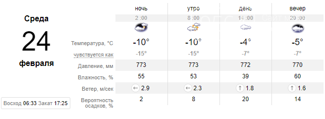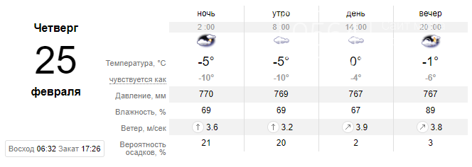 Несмотря облачность и снижение температуры до -10 °С, размеренный ветер с порывами до 3 м/с не сможет омрачить утреннее настроение. Ко дню резкое потепление до -4 °С и уменьшение скорости порывов до 2 м/с. День пройдет без осадков и, к сожалению, без солнечных лучей.