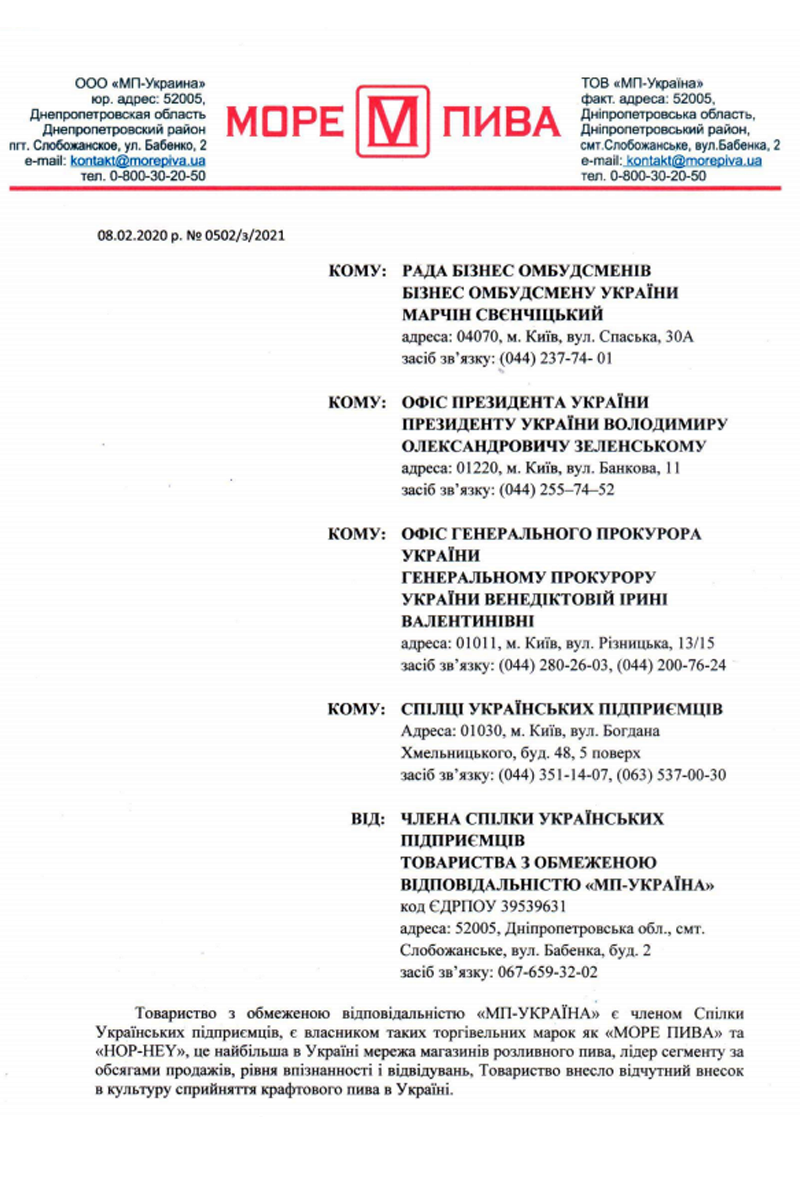 Руководство «МОРЕ ПИВА» направило официальное обращение к Президенту Украины