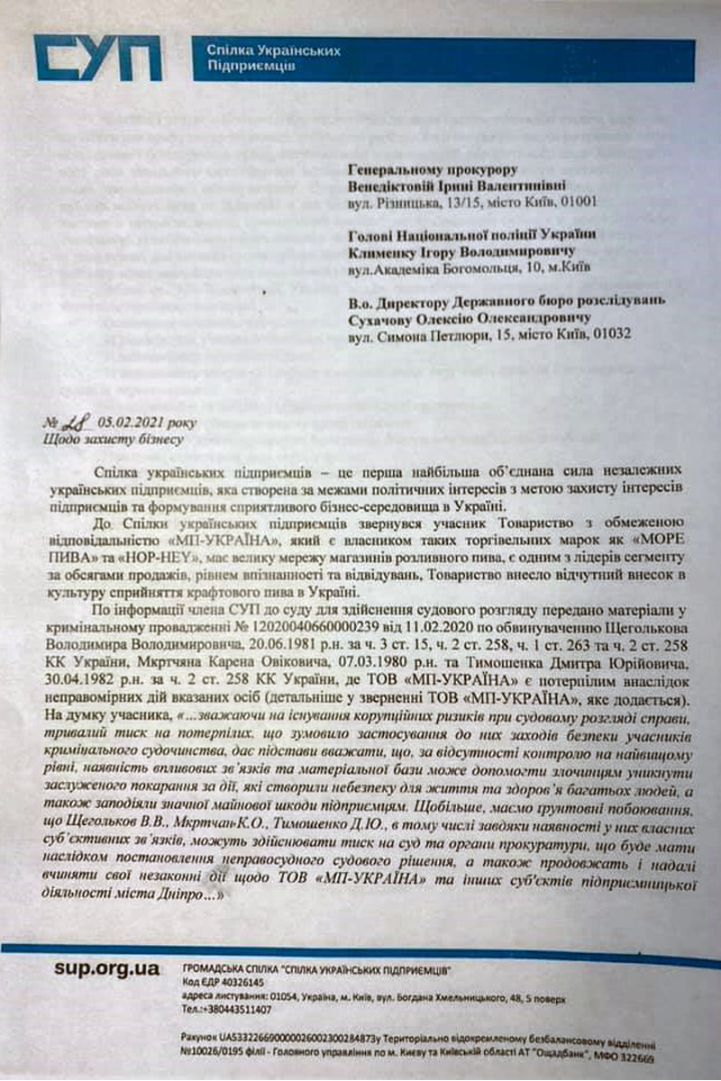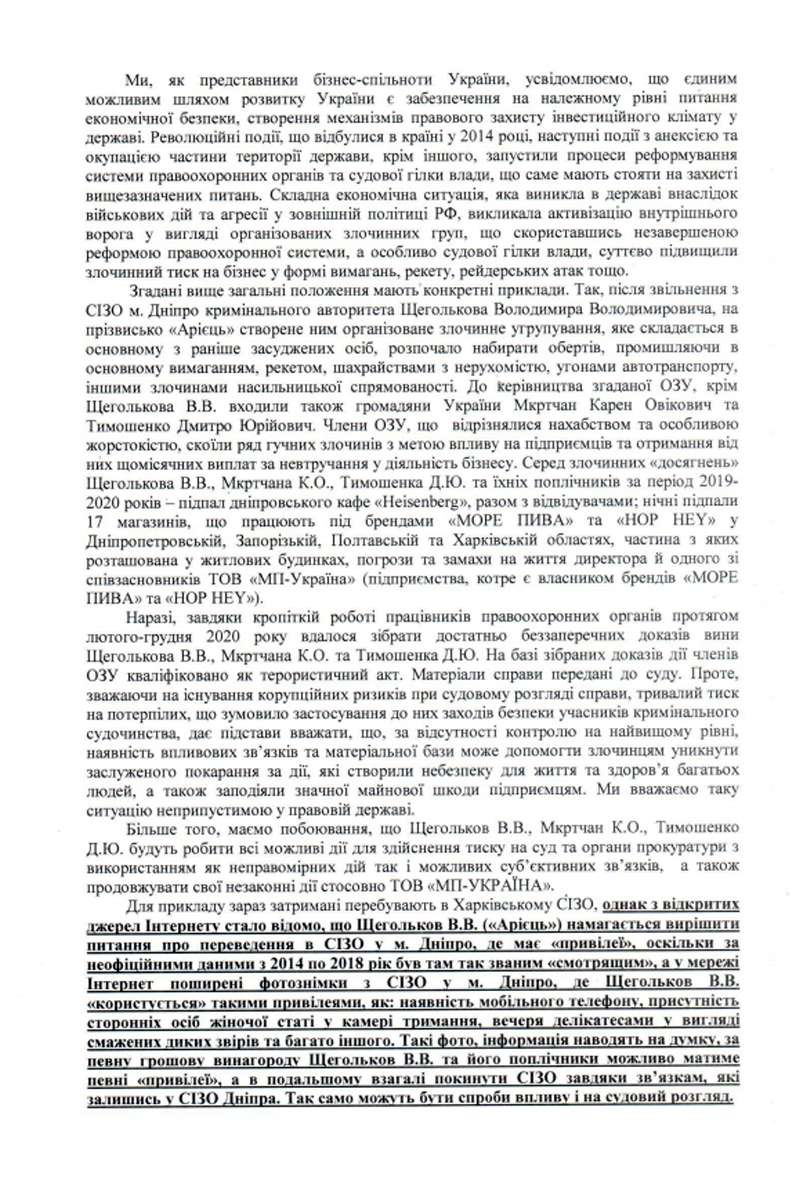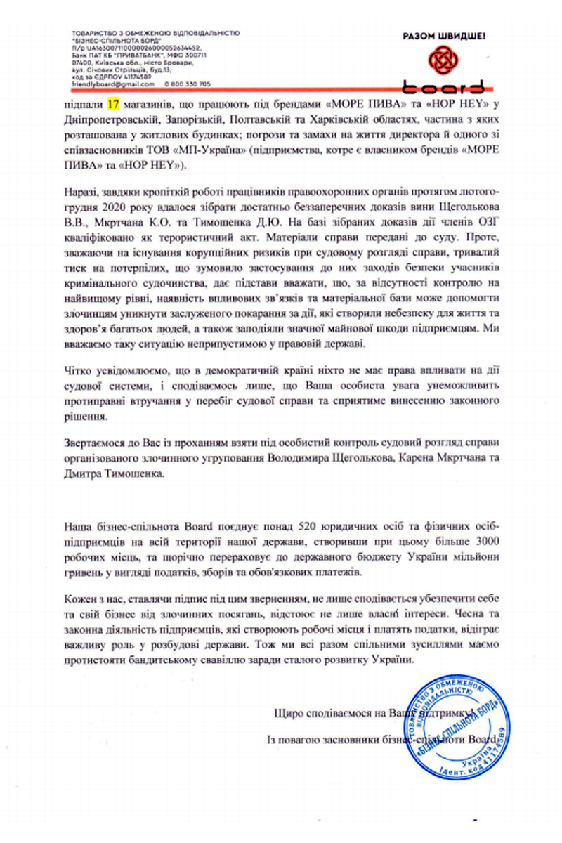 Руководство сети «МОРЕ ПИВА»/HOP HEY направило официальное обращение к Президенту Украины, Генеральному прокурору и Председателю Совета бизнес-омбудсмена Украины. Основанием для обращения стала необходимость дополнительного контроля за отсутствием коррупционной составляющей и давления на представителей системы судопроизводства при рассмотрении дела группировки Владимира Щеголькова (известного под прозвищем «Ариец»). Об этом на своей странице в Facebook сообщил один из основателей сети Алексей Кравец.