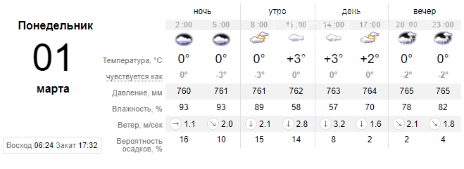 Неделя начнется с облачности, солнечной активности - минимум. Переменный ветер до 3-4 м/с на протяжении всего дня. Температура будет держаться на уровне от 0 °С до +3 °С.