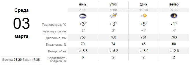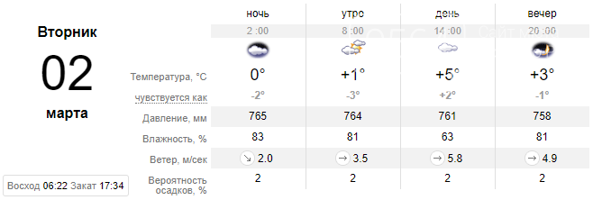 К середе погода уже улучшится и солнце будет чаще заметно на небе, но облачность по-прежнему будет сохраняться. Ветер усилится до 6-7 м/с. В первой половине дня ожидается уверенный "плюс" на градуснике, а вот ближе к вечеру уже заметен будет спад до -1 °С.