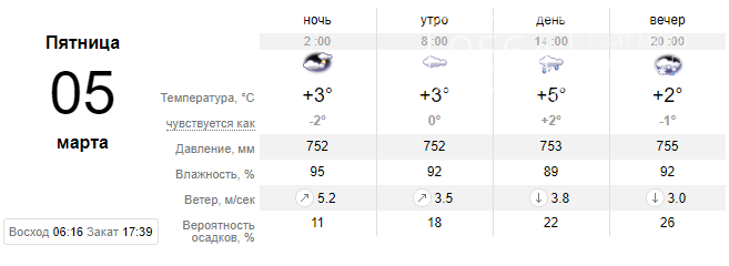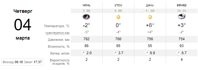 Прекрасный солнечный день, без осадков в дневное время. Температура на уровне +8 °С, что не может не порадовать. К сожалению, ветер усилится до 7-8 м/с и сохранит свою активность с дневного периода и вплоть до вечера. Благо, без осадков.