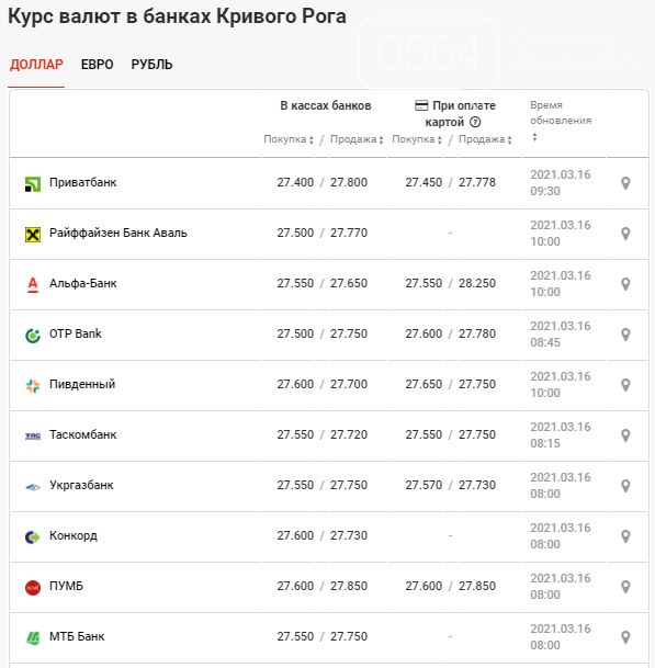 Курс доллара и евро в банках Кривого Рога по состоянию на 16 марта