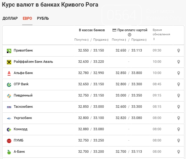 Курс евро в банках Кривого Рога