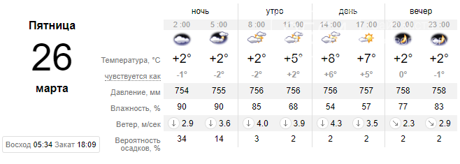 Температура с утра от +2 °С до +5 °С, ветер до 4-5 м/с. Днем ожидается потепление до +8 °С, солнце начнет появляться чаще. К вечеру стоит ожидать похолодание.