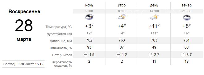 Воскресенье так же ожидается без осадков. Ветер изменчивый, порывы до 3-4 м/с. Комфортный день с минимальной солнечной активностью и максимальной температурой до +11 °С.