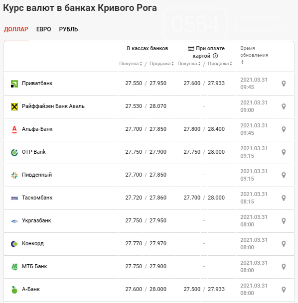 Курс доллара в банках Кривого Рога