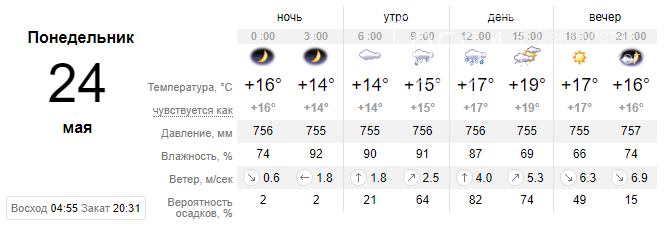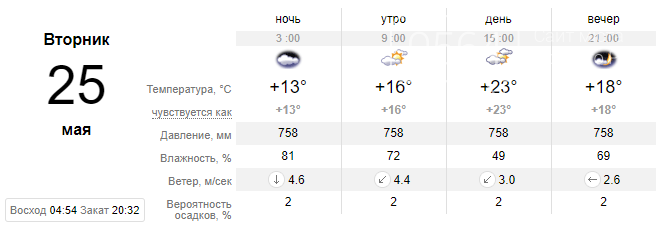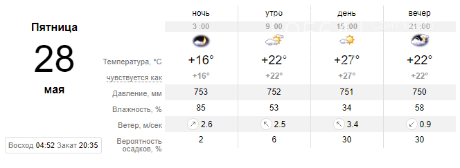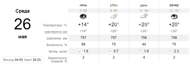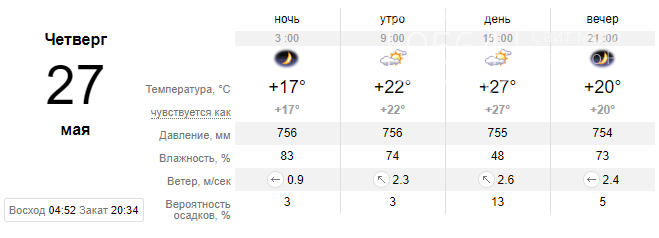 Переменчивая облачность на протяжении суток, к вечернему периоду - возможна ясность на небе. Температура в течение дня до +27 °С, порывы ветра до 3 м/с.