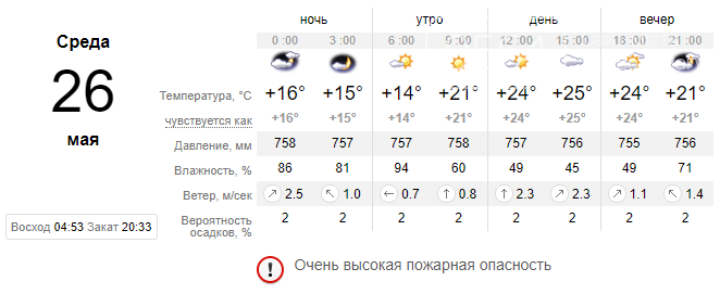 Утром ожидается солнечная погода, облачность будет минимальной. Ветер в течение дня не более 3 м/с, температура до +25 °С в своем максимуме. Осадков не предвидится.