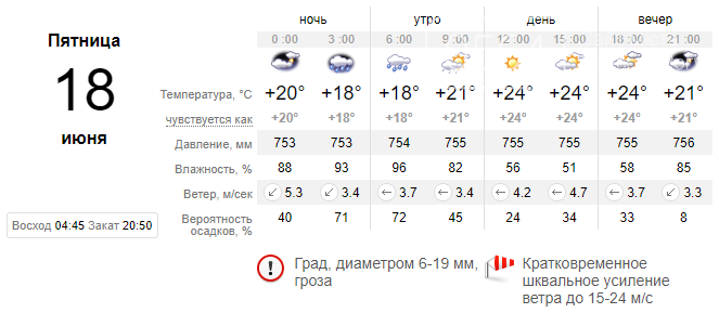 Утром ожидаются усиленный дождь и сплошная облачность, вероятно кратковременное усиление порывов ветра до 20 м/с. Днем солнечное прояснение продлится недолго, а ближе к вечеру прогнозируют град и вновь шквал.