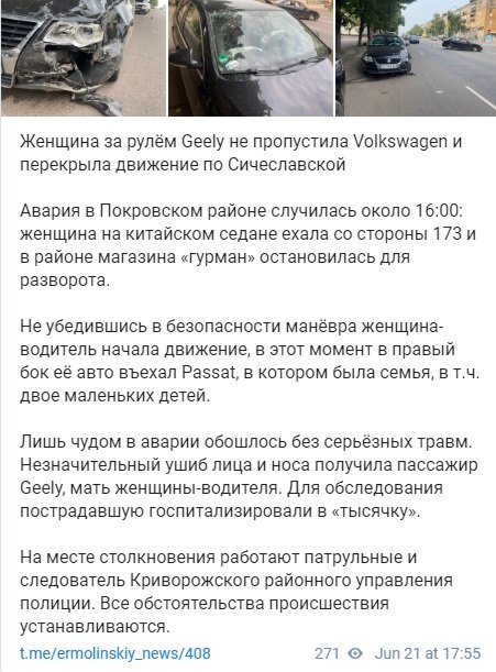 "Лишь чудом в аварии обошлось без серьёзных травм. Незначительный ушиб лица и носа получила пассажир Geely, мать женщины-водителя. Для обследования пострадавшую госпитализировали в "тысячку", - пишется в блоге.