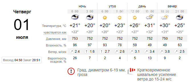 Несмотря на солнечное утро и относительную безоблачность, во второй половине дня прогнозируют резкое ухудшение погодных условий: дожди, град и грозы, местами шквал до 24 м/с. При этом, влажность останется на умеренном уровне, а температура воздуха может возрасти до 30-31 °С.