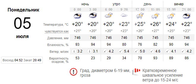 Согласно данным Укргидрометцентра, поступила информация, что 5 июля ожидаются грозы по Украине, днем в южных и центральных областях местами значительные дожди, град и шквальные порывы ветра до 15-24 м/с (I уровень опасности, желтый).