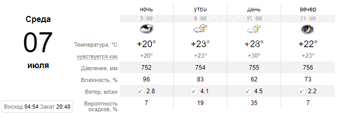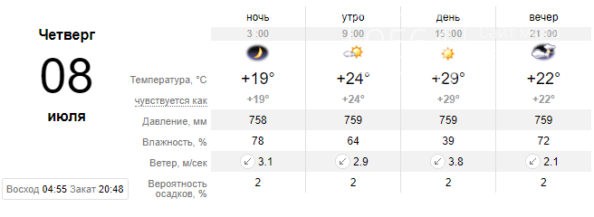 Погода в этот день будет солнечной и теплой, до второй половины дня обещают до +30 °С и минимальную влажность, а порывы ветра до 3-4 м/с. Дождей не предвидится, осадков не будет.