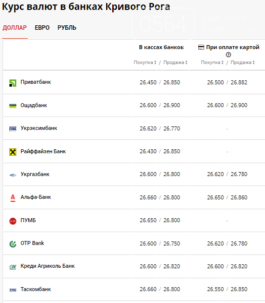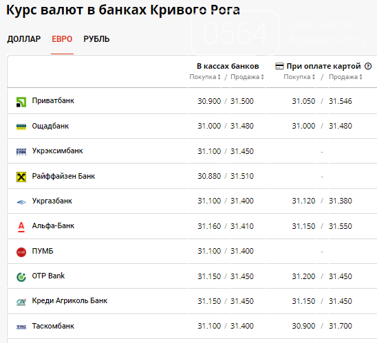 В банках Кривого Рога курс доллара установлен следующий - в пределах 26,650 - 26,800 гривен. Что касательно курса евро, то он составил 31,145 - 31,430 гривен.