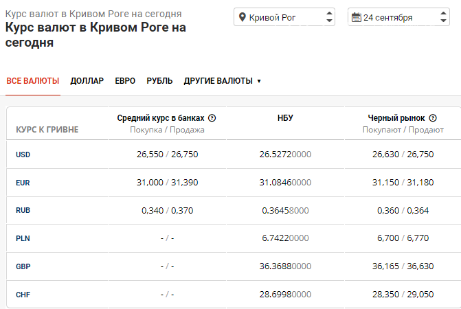 По состоянию на утро 24 сентября Нацбанк установил официальный курс доллара в Кривом Роге а также утвердил новую стоимость гривны относительно иностранных валют.