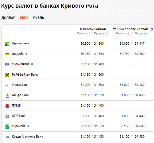 В банках Кривого Рога курс доллара установлен следующий - в пределах 26,550 - 26,750 гривен. Что касательно курса евро, то он составил 31,000 - 31,390 гривен.