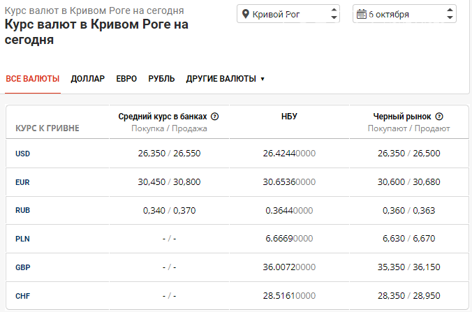 По состоянию на утро 6 октября Нацбанк установил официальный курс доллара в Кривом Роге а также утвердил новую стоимость гривны относительно иностранных валют.