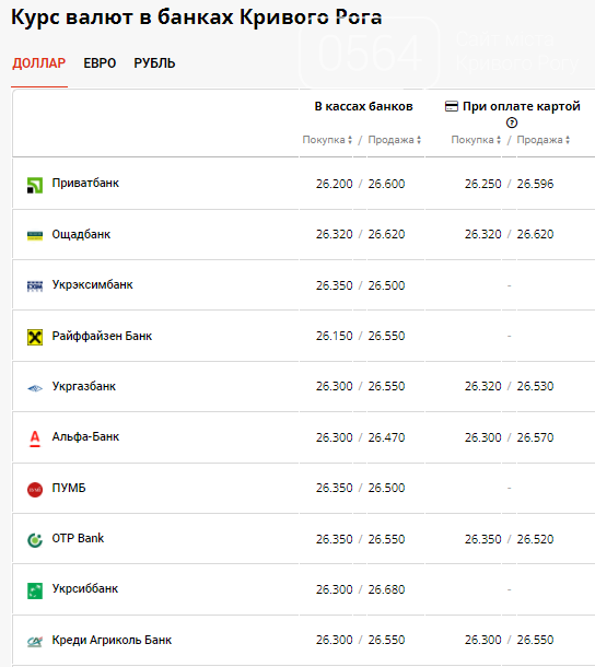 В банках Кривого Рога курс доллара установлен следующий - в пределах 26,350 - 26,550 гривен. Что касательно курса евро, то он составил 30,450 - 30,800 гривен.