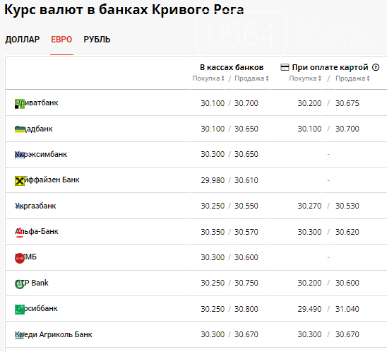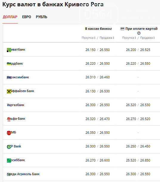 В банках Кривого Рога курс доллара установлен следующий - в пределах 26,300 - 26,490 гривен. Что касательно курса евро, то он составил 30,300 - 30,650 гривен.