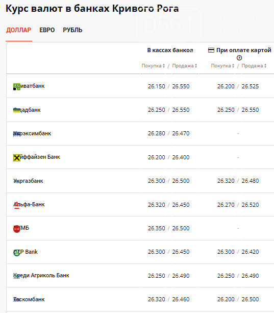 В банках Кривого Рога курс доллара установлен следующий - в пределах 26,300 - 26,460 гривен. Что касательно курса евро, то он составил 30,300 - 30,600 гривен.