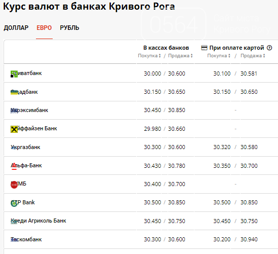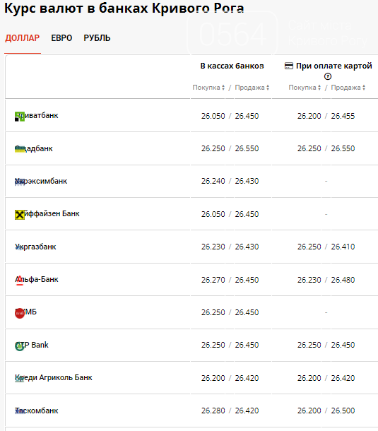 В банках Кривого Рога курс доллара установлен следующий - в пределах 26,250 - 26,450 гривен. Что касательно курса евро, то он составил 30,350 - 30,650 гривен.