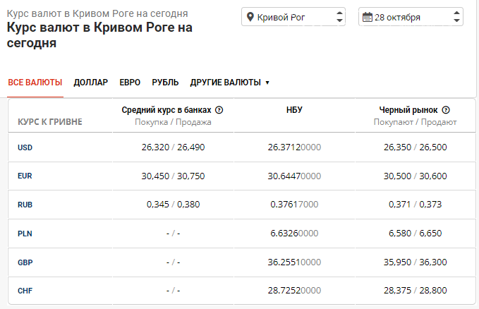 По состоянию на утро 28 октября Нацбанк утвердил официальный курс доллара в Кривом Роге и новую стоимость гривны относительно иностранных валют.