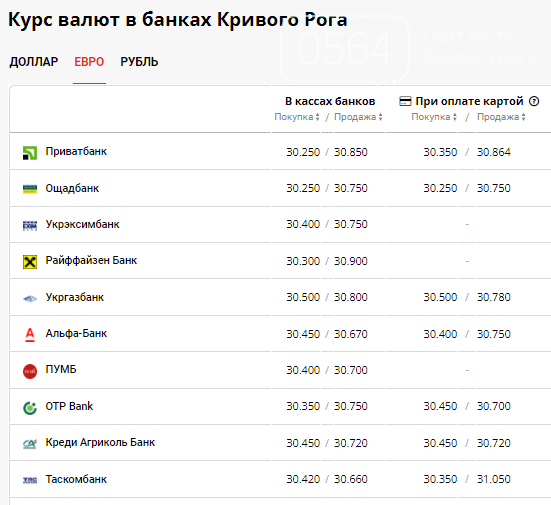 Курс евро в банках Кривого Рога