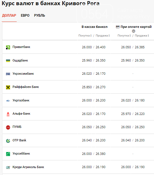 Курс доллара в банках Кривого Рога