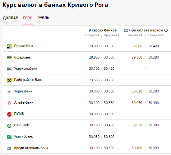 Курс евро в банках Кривого Рога