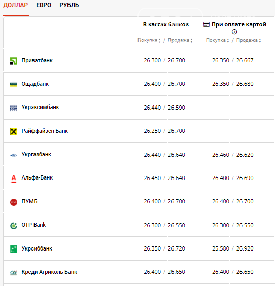 Курс доллара в банках Кривого Рога
