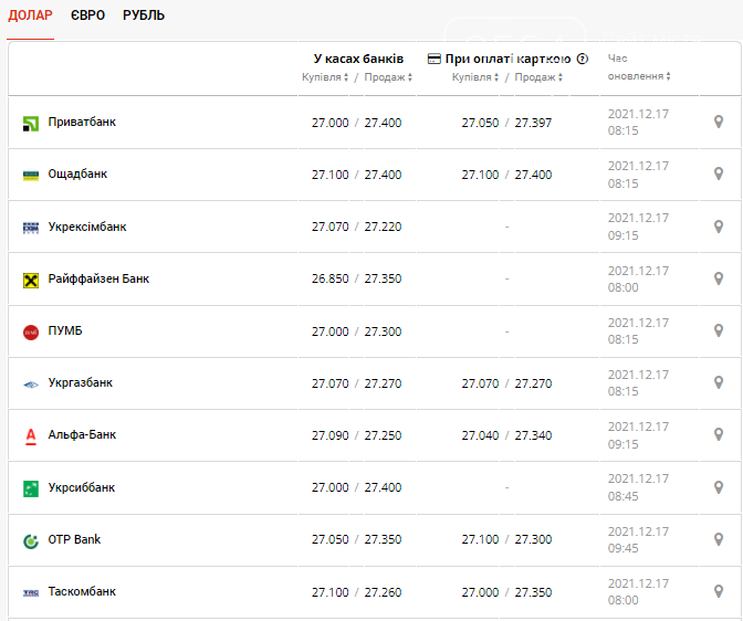 В банках Кривого Рога курс доллара установлен следующий - в пределах 27,085 - 27,300 гривен. Что касательно курса евро, то он составил 30,500 - 30,900 гривен.