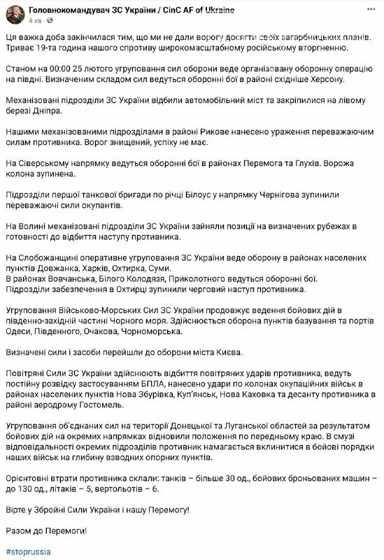 "Эти тяжелые сутки закончились тем, что мы не дали врагу достичь своих захватнических планов. Продолжается 19 часов нашего сопротивления широкомасштабному российскому вторжению.