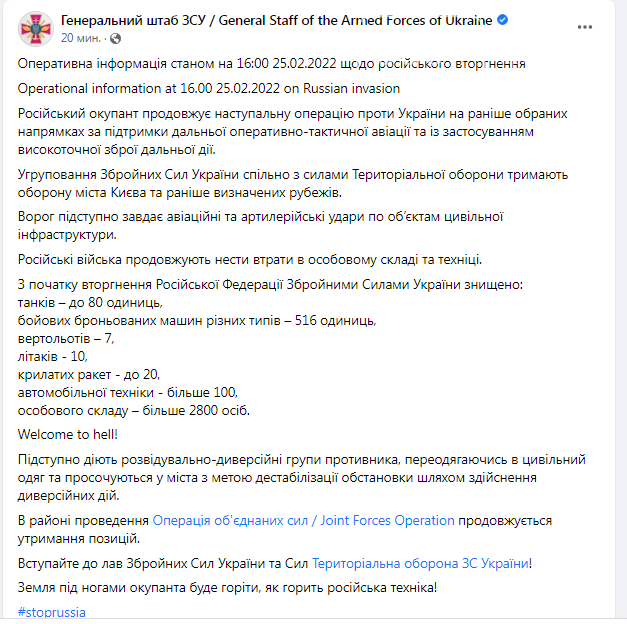 Генштаб ВСУ опубликовал оперативную информацию по состоянию на 16:00 25.02.2022 по российскому вторжению.