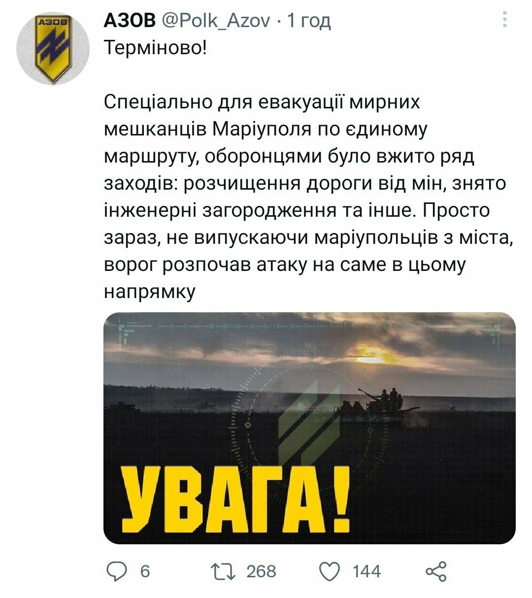 Ворог розпочав атаку на Маріуполь через коридор, яким повинні були рухатись мирні мешканці, - Азов