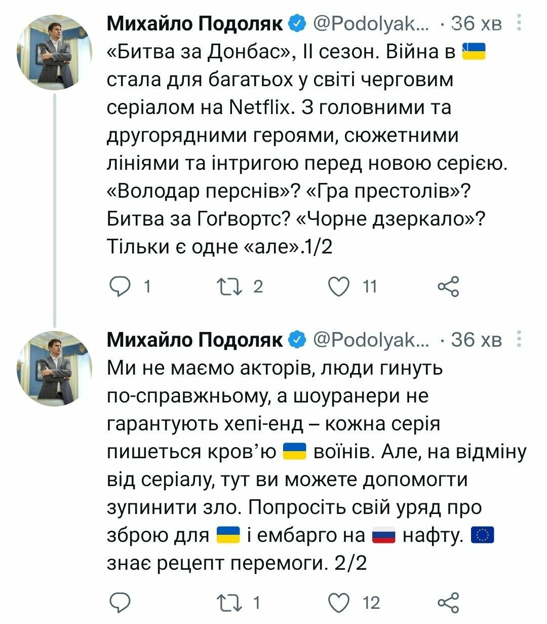 З головними та другорядними героями, сюжетними лініями та інтригою перед новою серією. «Володар перснів»? «Гра престолів»? Битва за Гоґвортс? «Чорне дзеркало»? Тільки є одне «але». Ми не маємо акторів, люди гинуть по-справжньому, а шоуранери не гарантують хепі-енд – кожна серія пишеться кров’ю українських воїнів. Але, на відміну від серіалу, тут ви можете допомогти зупинити зло. Попросіть свій уряд про зброю для України і ембарго на російську нафту. Євросоюз знає рецепт перемоги.