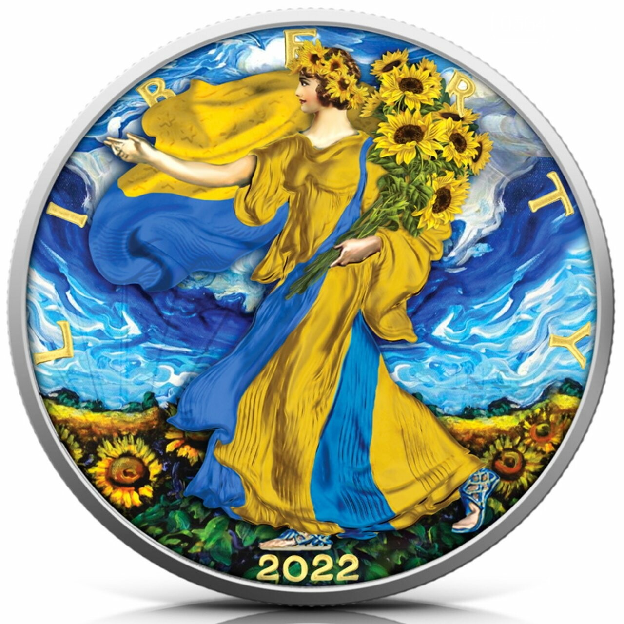 У дизайні інвестиційних монет 2022 року відображені безліч українських національних символів. На реверсі першої монети навколо жінки у квітковому вінку розвівається синьо-жовтий прапор.