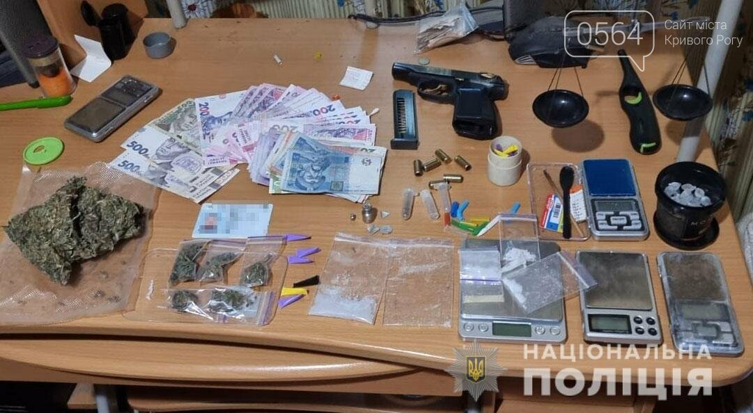 Наступного дня поліцейські управління боротьби із наркозлочинністю Дніпропетровщини за участю слідчого відділення поліції № 3 Криворізького РУП під процесуальним керівництвом прокурора Криворізької північної окружної прокуратури провели обшук за місцем мешкання 30-, та 38-річних місцевих жителів. Під час слідчих заходів вони вилучили сліп-пакети з канабісом та метамфетаміном, травматичний пістолет з набоями, гроші та електронні ваги.