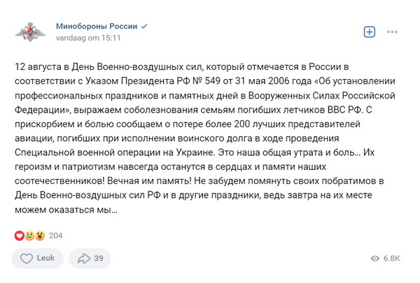 Так, на сторінці російського міністерства оборони повідомляється, що під час проведення "спецоперації" в Україні загинуло понад 200 "найкращих представників авіації", повідомляє ghall.com.ua.