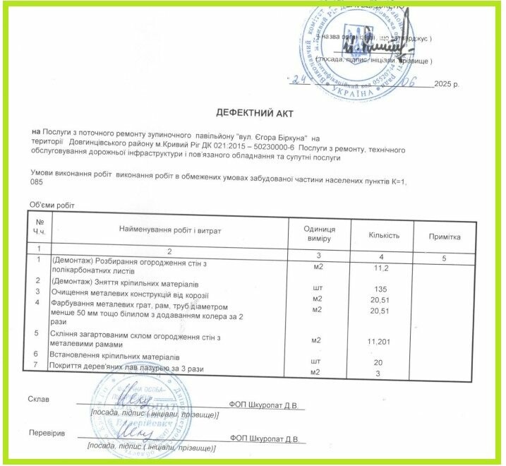 Також 17 червня з підприємцем Шкуропатом райвиконком підписав договір на послуги з поточного ремонту зупиночного павільйону ʺШколаʺ вул. 21-ї бригади Національної гвардії (в напрямку вул. Єгора Біркуна) . Вартість послуг за цим договором становить 71 835,51 грн. Що саме мали відремонтувати, дивіться у дефектному акті: