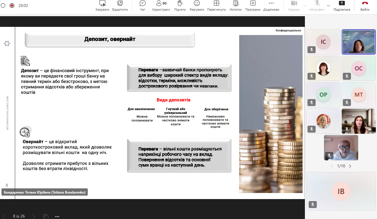 На початку зустрічі фахівці традиційно розповіли студентам ключову інформацію про Групу Метінвест, напрями діяльності активів, пріоритети компанії у воєнний час, а далі зосередились безпосередньо на темах вебінарів: фінансовій звітності та фінансових інструментах, які застосовує держава, бізнес і також Група Метінвест.
