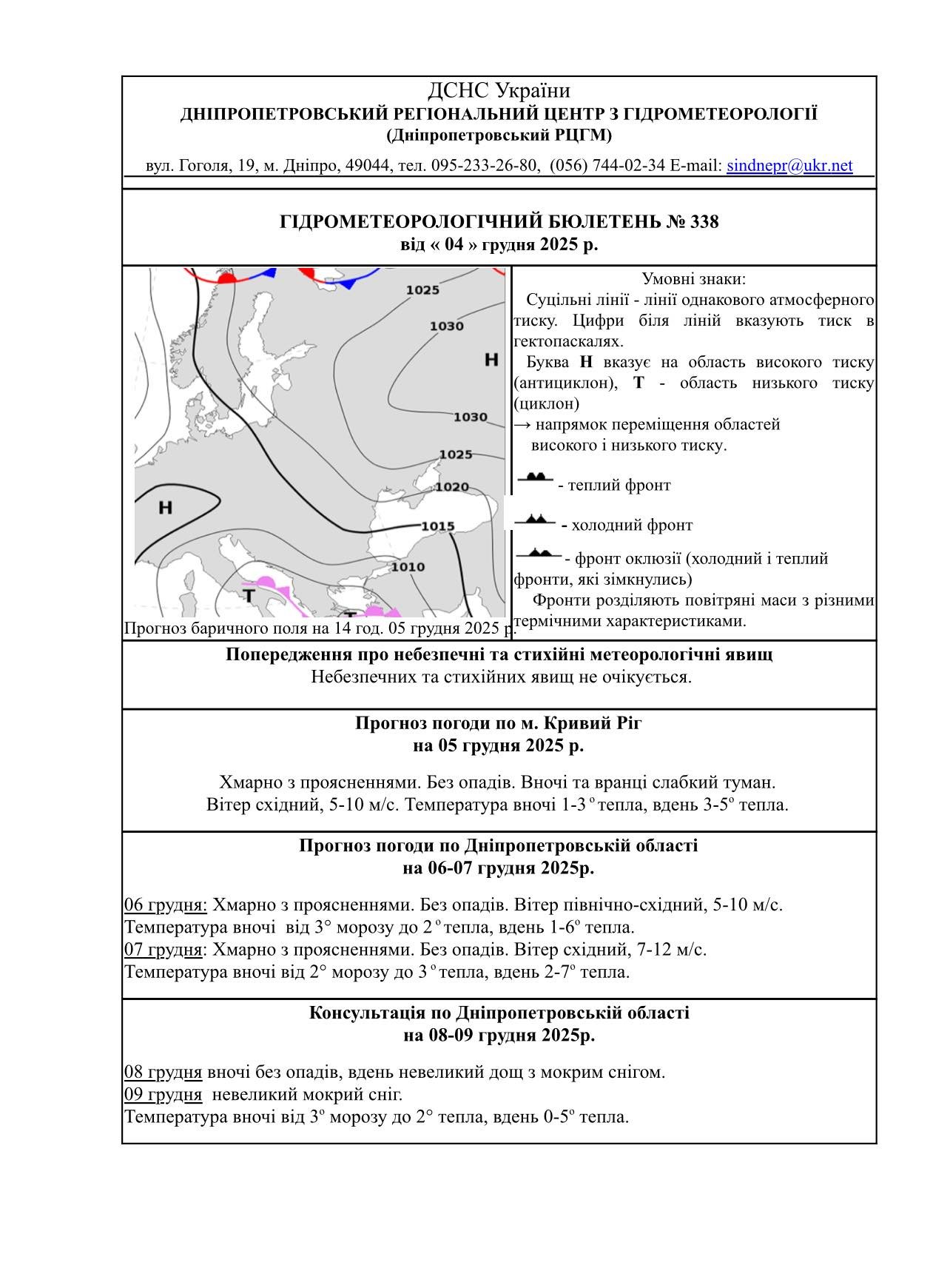 У вихідні дні 6 та 7 грудня на Криворіжжі буде хмарно з проясненнями, без опадів, вночі очікується невеликий мороз.
