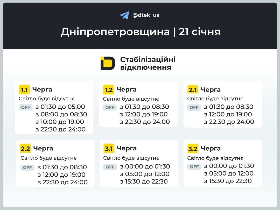 Водночас обленерго розробили графіки погодинних відключень на 21 січня з урахуванням часу та обсягу обмежень, визначених Укренерго.