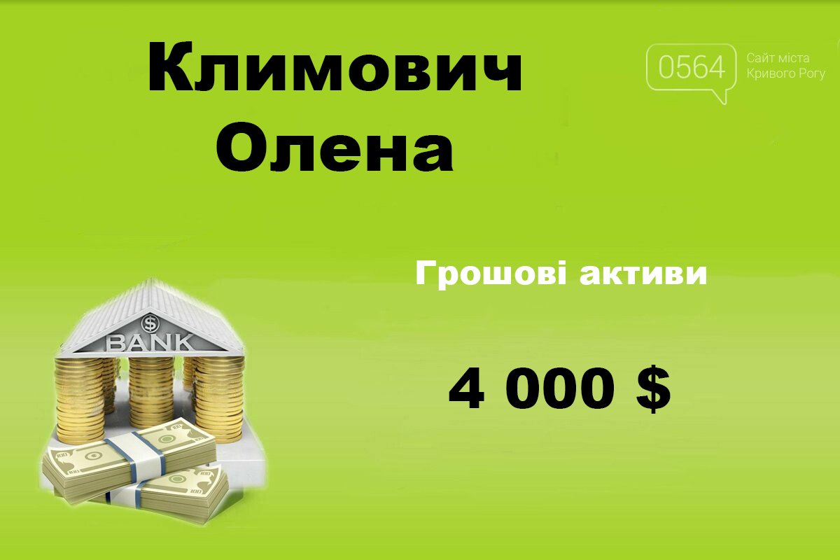 Олена Климович вказала, що має грошові активи в розмірі 4000 доларів (готівка).