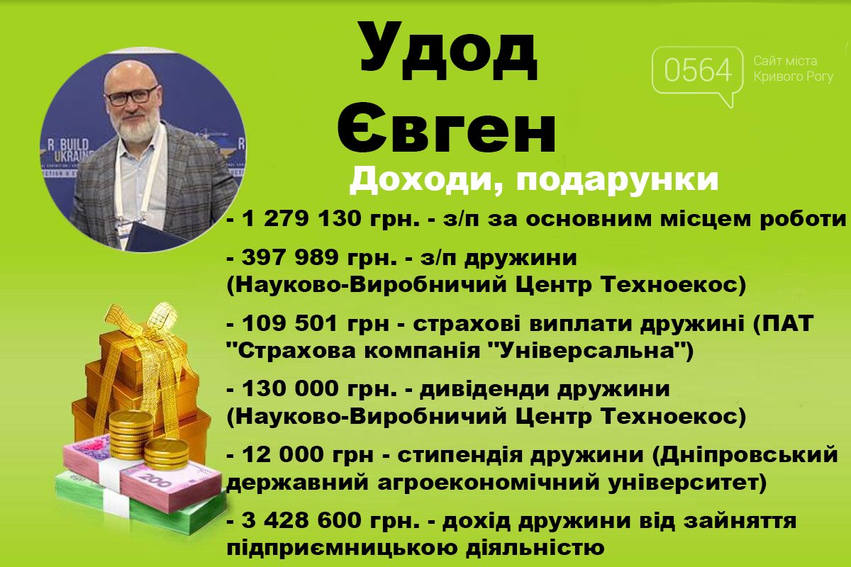 Перший заступник міського голови Кривого Рогу Євген Удод оприлюднив дані про свої статки та доходи родини за 2025 рік. Згідно з е-декларацією на сайті НАЗК, сукупний бюджет сім’ї посадовця зріс і склав понад 5,3 млн грн, де основну частину прибутку принесла підприємницька діяльність його дружини. Сам чиновник офіційно не володіє нерухомістю чи автотранспортом, а у власності його дружини перебувають три іномарки, зокрема придбана у 2023 році AUDI Q7 вартістю понад 3,7 млн грн. Також заступник мера продовжує зберігати значні грошові активи у розмірі 112 200 доларів США.