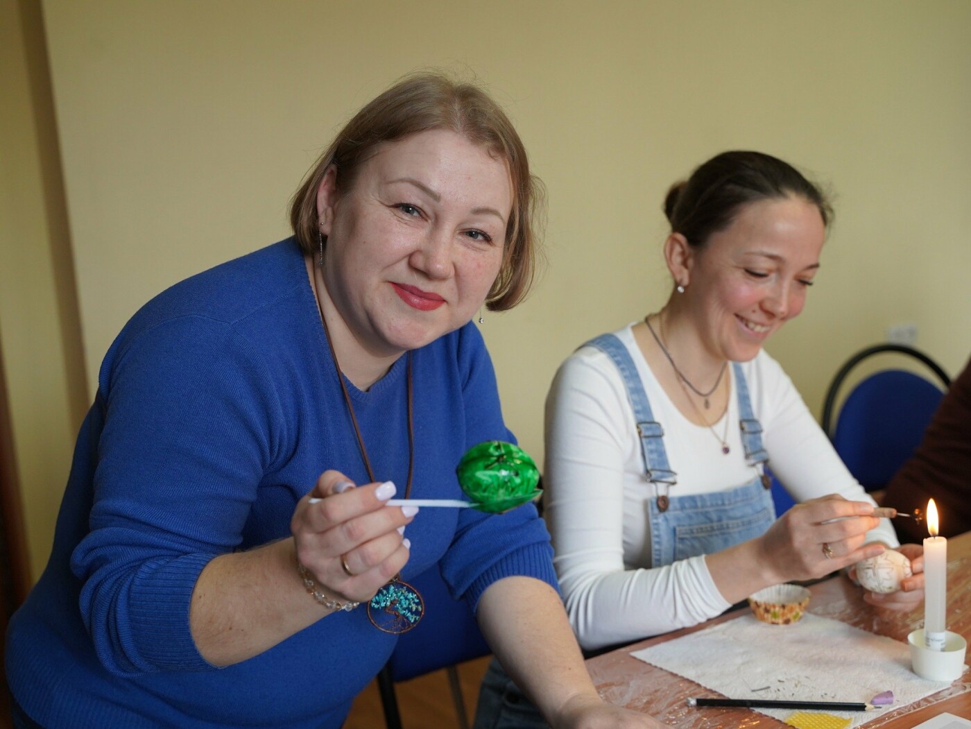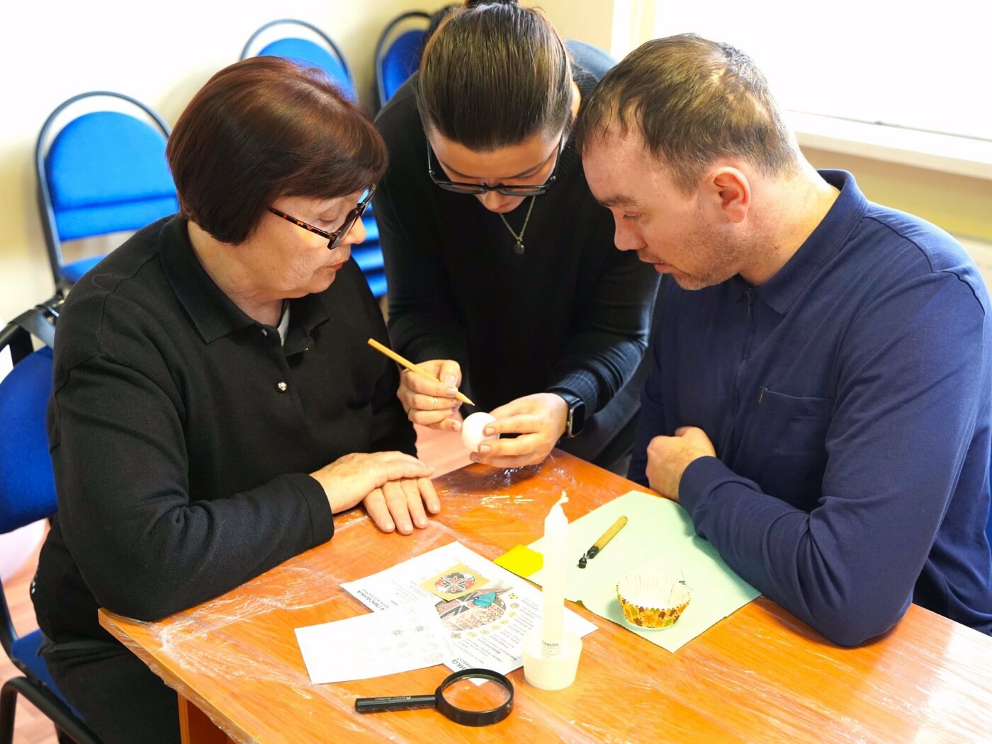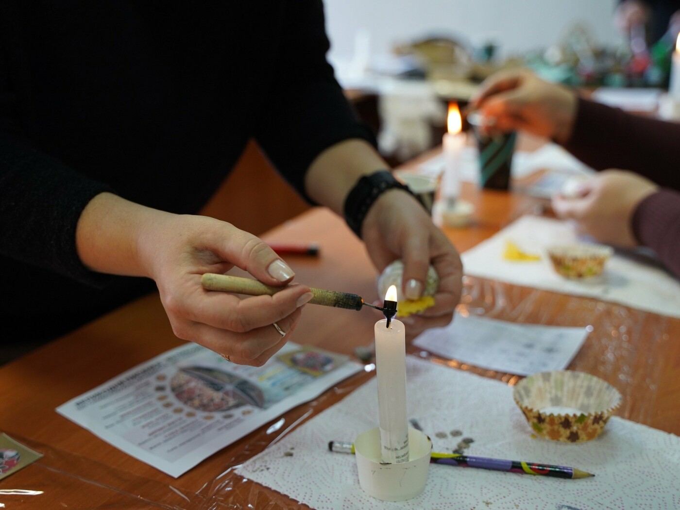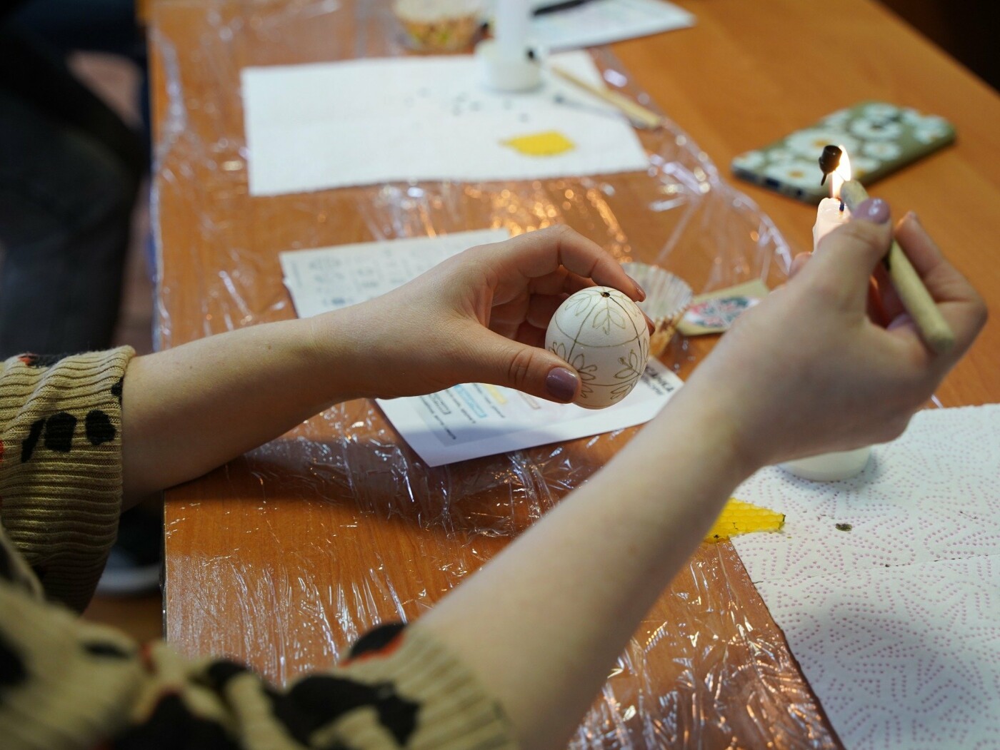 Під наставництвом мисткині учасники працювали у старовинній техніці воскування: гарячим воском наносили візерунок на поверхню шкаралупи, а потім поетапно занурювали яйце у натуральні барвники — від світлих до темних, формуючи писанки.