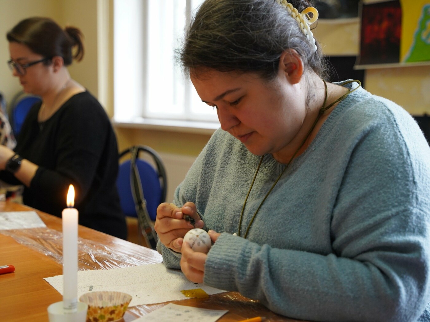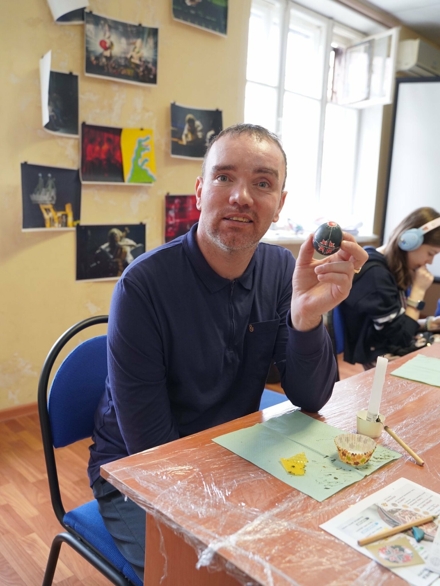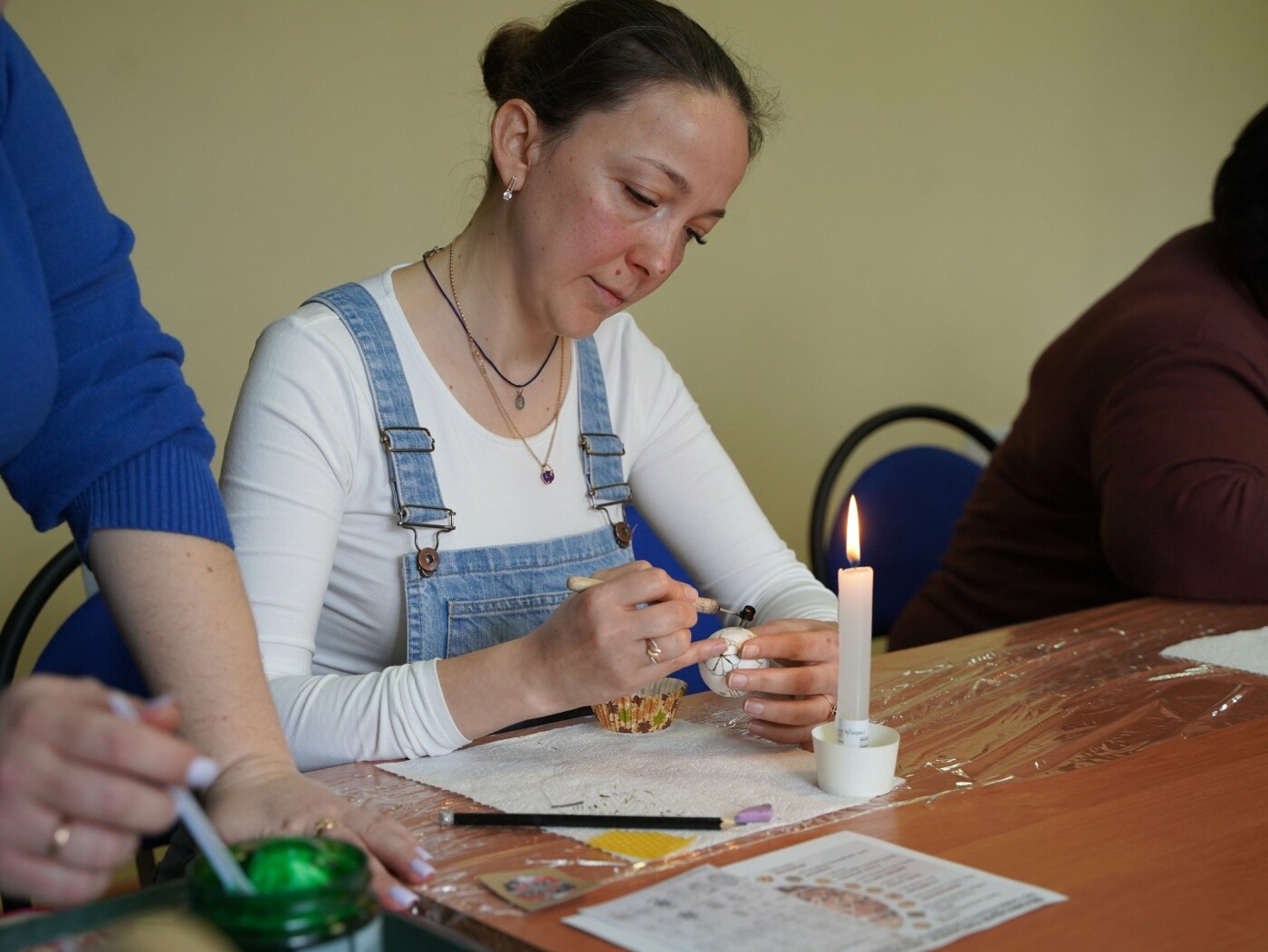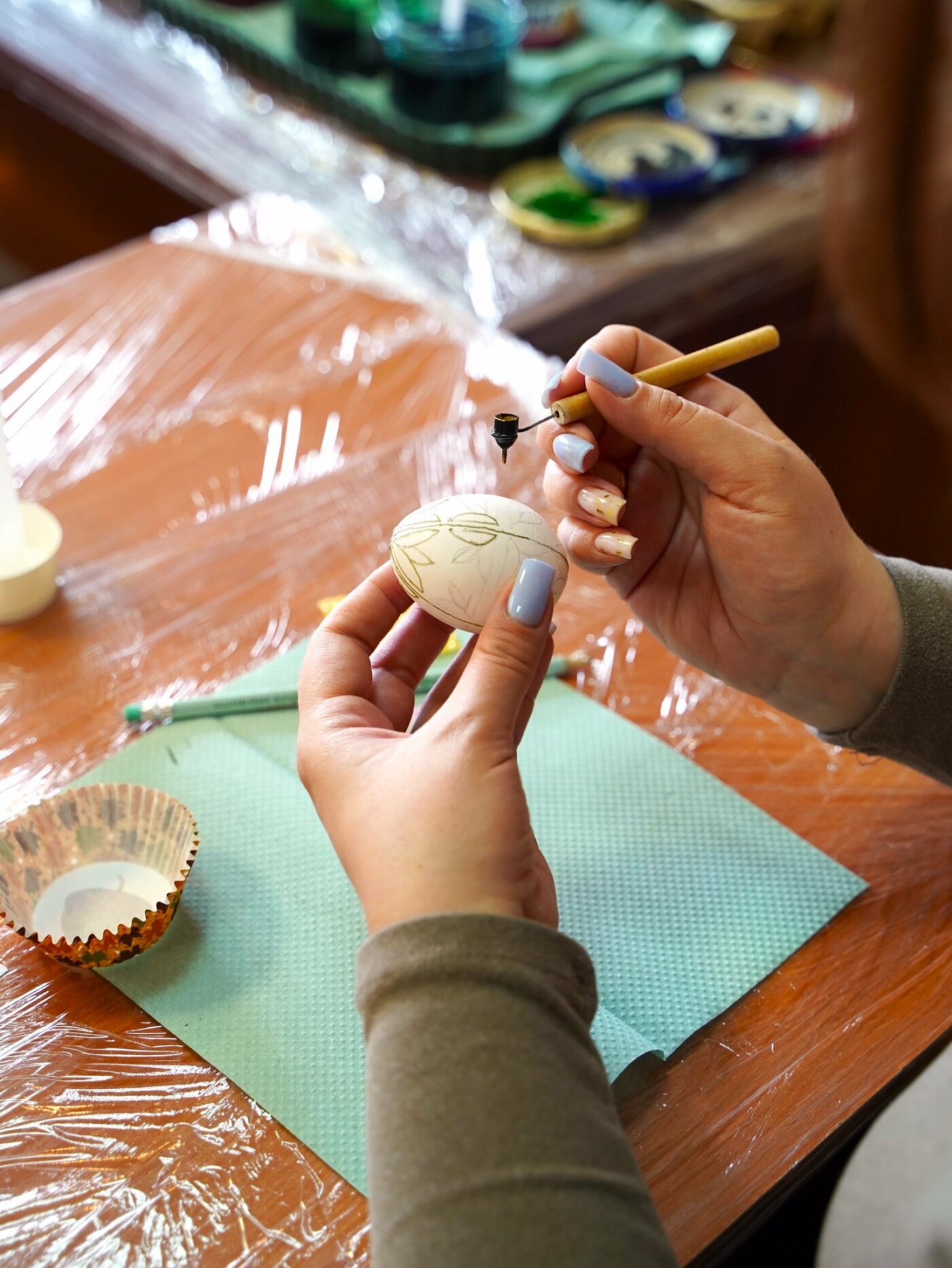 Під наставництвом мисткині учасники працювали у старовинній техніці воскування: гарячим воском наносили візерунок на поверхню шкаралупи, а потім поетапно занурювали яйце у натуральні барвники — від світлих до темних, формуючи писанки.