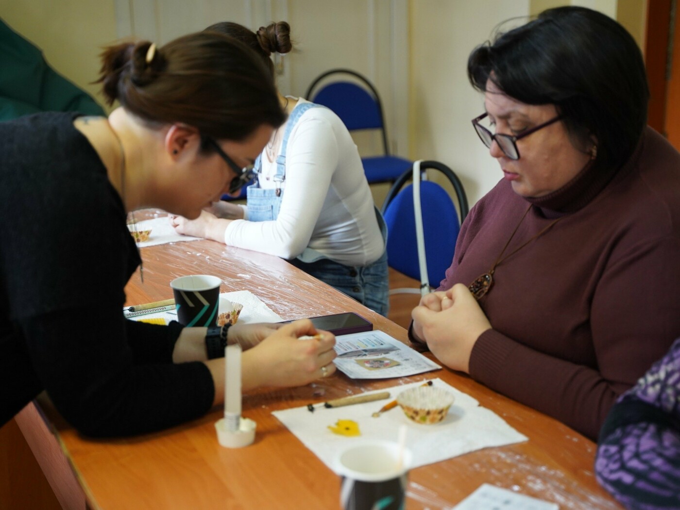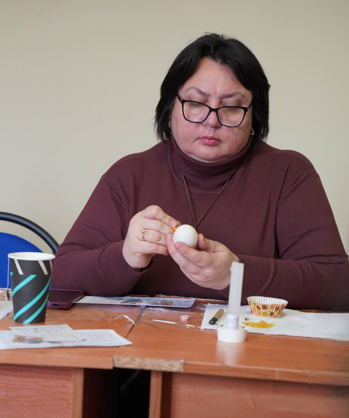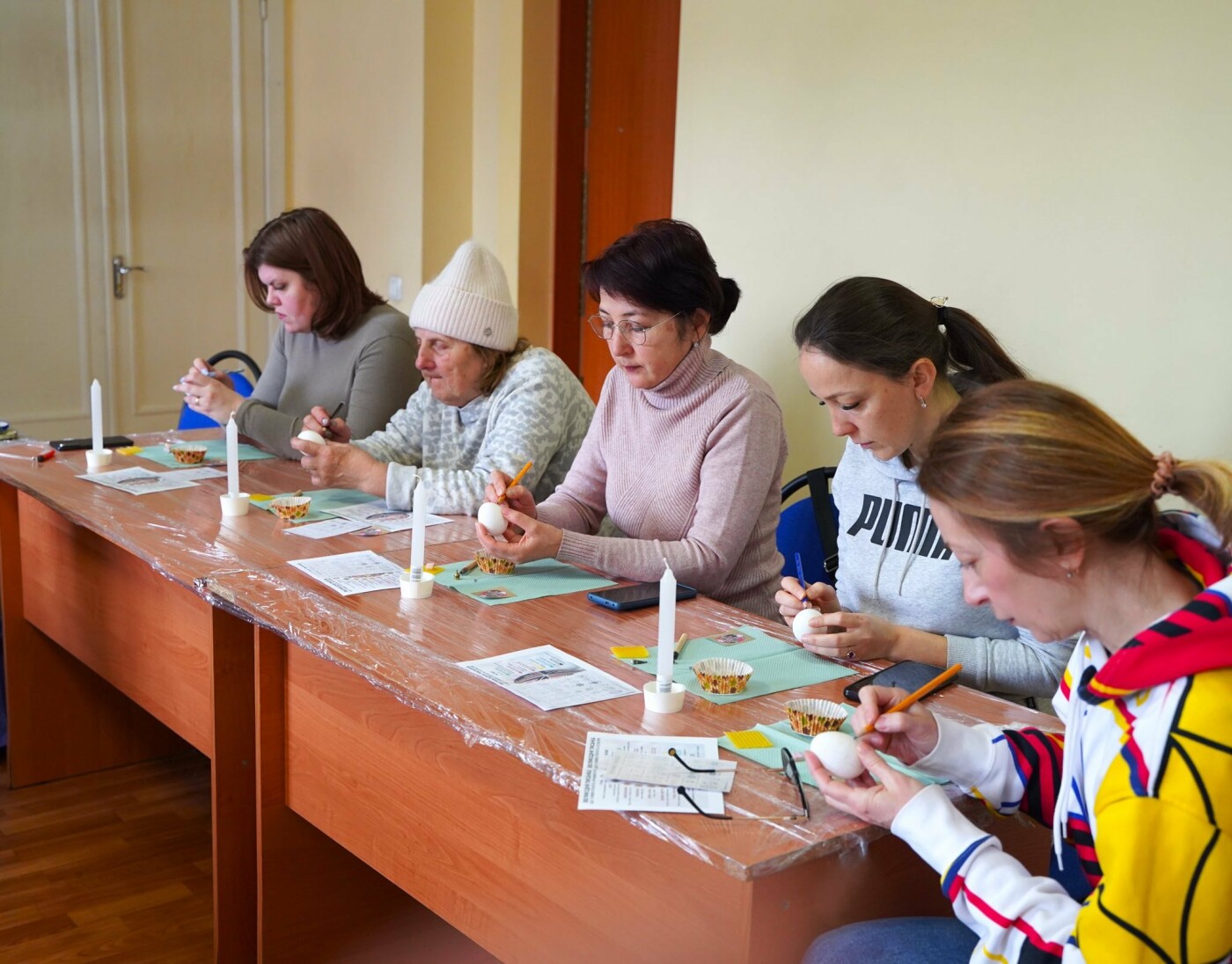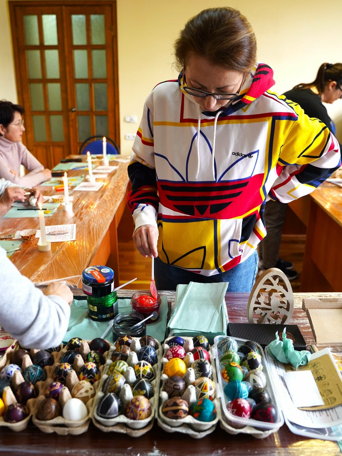 Під наставництвом мисткині учасники працювали у старовинній техніці воскування: гарячим воском наносили візерунок на поверхню шкаралупи, а потім поетапно занурювали яйце у натуральні барвники — від світлих до темних, формуючи писанки.