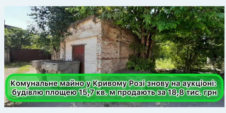 У Кривому Розі повторно виставили на продаж комунальне майно - нежитлову будівлю. Вартість нерухомості знижено вдвічі і становить 18 874,50 грн. Управління комунальної власності міста виконкому Криворізької міської ради виставив повторно на аукціон нежитлову будівлю, загальною площею 15,7 кв. м, за адресою: вул. Іорданська, буд. 6-А. Про це повідомляє 0564.ua, посилаючись на сайт "Прозорро.Продажі". Ознайомитись з об’єктом можна в робочі дні з 08-30 до 1...